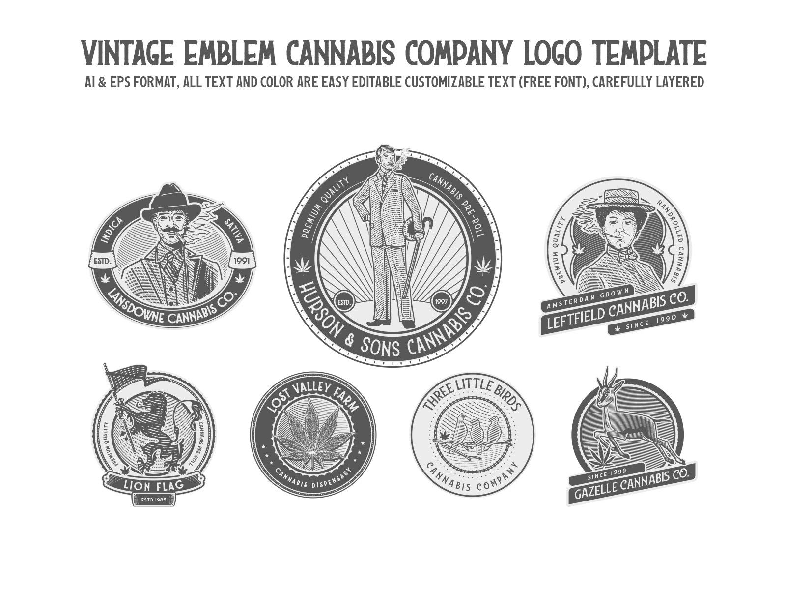 Vintage Emblem Cannabis Company Logo Template for Emblem Supply Co. for use in corporate branding, e-commerce, and entrepreneurship. These logo template sets include badges, and other elements for creating unique, vintage, and modern logos.
